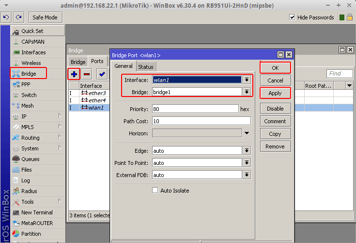Tahap kedua yaitu menambahkan port interface yang akan di jadikan brigde, di pola tutorial ini aku akan mem-bridge port interface ether3, ether4 dan wlan1, masih di sajian Brigde klik tab Ports > klik tanda plus (+) > kemudian pada parameter Interface silahkan pilih port yang akan di brigde kemudian klik Apply dan OK. Silahkan ulangi sesuai dengan jumlah port yang akan di brigde.